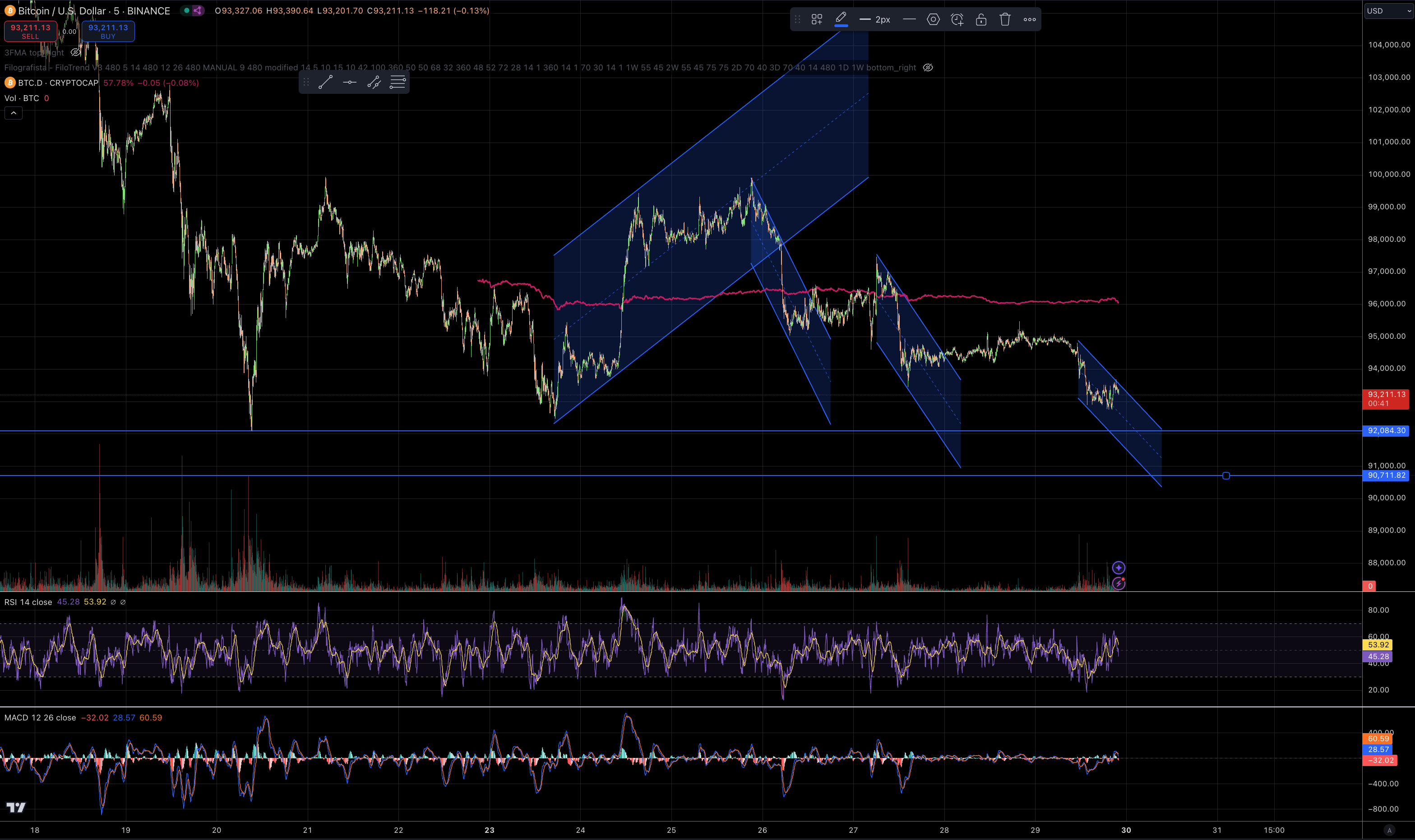 Además del ATH, lo que estamos viendo es una caída que forma un triángulo descendente, ya que ha estado respetando los mínimos en torno a los 92k. El reto de perforar este fondo continúa, lo que llevaría a la gama de 90k. Esto te recuerda la necesidad de revisar los gráficos que cubren semanas, incluso si tu objetivo es el corto plazo.