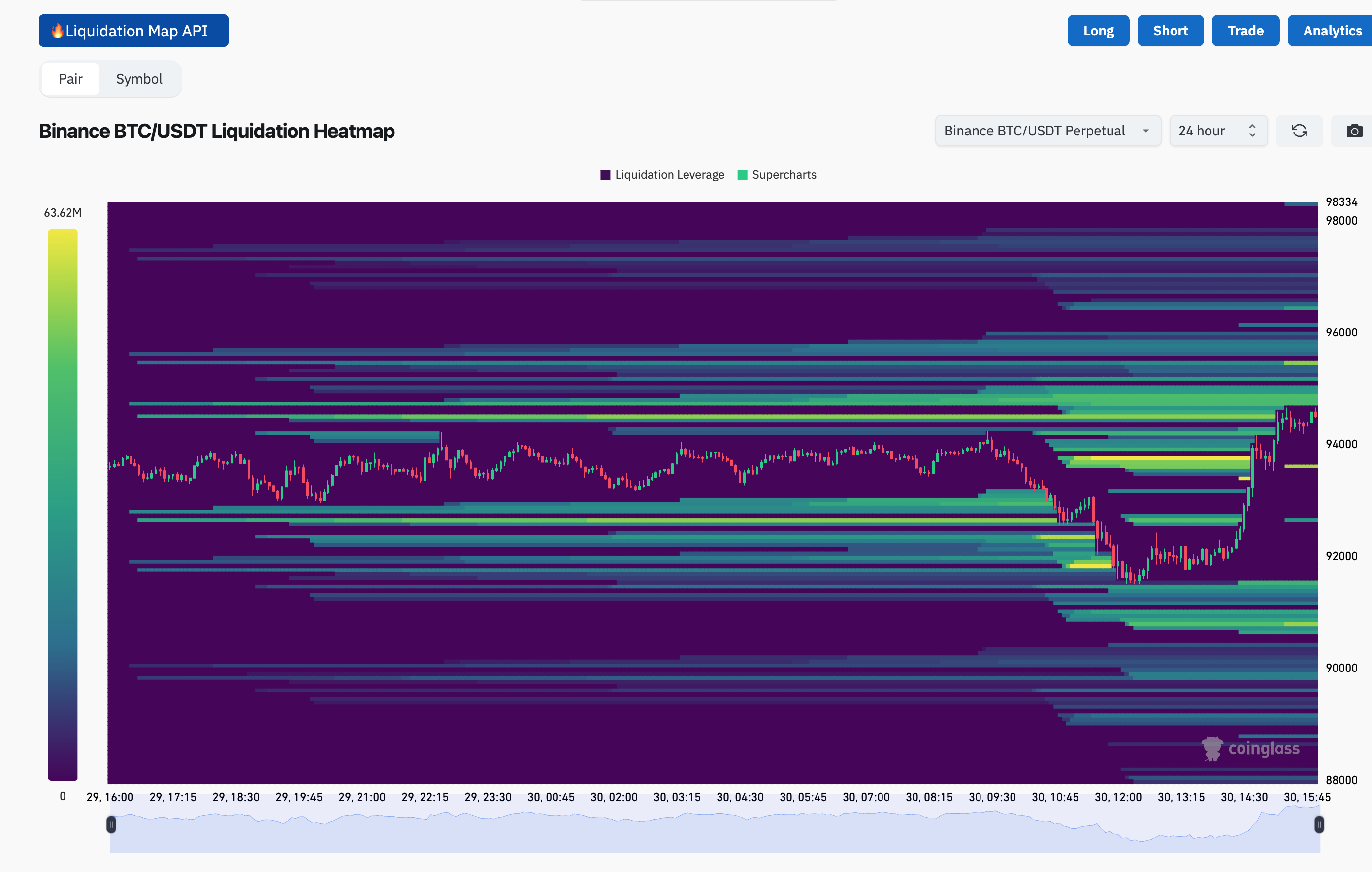 Siempre me ha parecido muy bonito el gráfico de liquidación de Coinglass, pero no guía tus próximos pasos. Muestra el volumen de liquidaciones que se han producido, pero esto no representa una resistencia real a la subida/bajada del activo. A veces me detengo a mirar, pero no me detengo por ello, aunque sea hermoso.